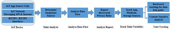 The authors identified the data flow from potential risk sources to sinks due to default configuration setup, user carelessness, and malicious intent. Any app that leaks sensitive data, with or without device/user permissions, is considered malicious. Such apps act like trojans to violate user privacy and deviate from the original functional state. The IoT OS with root-level permissions leak information when granted default access to device-specific modules. External threats easily bypass any security controls of the IoT platform and exploit via the communication channels. The application source code is analyzed to identify any trace of sensitive data from potentially suspicious sources. Flag labels denote the data sensitivity level, type, and source. The static analysis tracks the data flow in the device and propagation in various stages by the application and the network interfaces. Any trace of the labeled data being transmitted out of the previously determined data flow in the app or at outbound sources to the messaging module or the Internet, an alert is raised by the proposed framework. However, the flagged data getting leaked is malicious or violates privacy is not flagged. This decision is left to the user to make an informed decision and rule about potential sensitive data leaks or privacy risks, as shown in Figure 4.