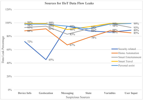 This research categorized each IioT device based on the application functionalities and source code for suspicious sources and data leaks. It was found that all IioT devices are leaking data and device information. The abnormally high percentage further emphasizes the research objective regarding IoT devices being insecure and potentially exploitable. The data are analyzed and presented in Table 4 and illustrated in Figure 6.