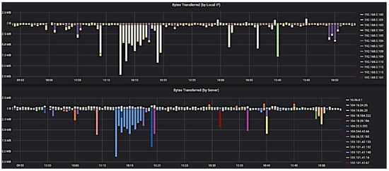 The authors performed an initial analysis of the IioT devices for the app permissions and data flow route of the 256 applications. The check was performed to detect outbound permissions to the Internet and messaging. From the initial analysis, around 80% of official applications of vendors and 84% of unofficial applications were red-flagged as suspicious and potentially leaking data to external sources. Of these red-flagged apps, official apps had 26% of both Internet and messaging access, while unofficial apps and 42%. Internet access was 24–25% for both types of applications. However, official apps displayed 49% of secure messaging calls, while unofficial apps had 34% of messaging counts. This revealed that the official applications followed good practices and were manually verified for concurrent connections to the devices, as presented in Figure 7. The authors gathered network traffic data from the IioT devices and performed network traffic analysis using a graphite monitoring service.