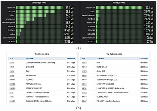 The results also reveal that IoT applications tend to implement little or no security controls to protect data and logs. Data flows depend on application functionalities, so outbound flow to the Internet or messaging services cannot be avoided. The IioT devices are connect with external URLs, Autonomous System Numbers (ASNs), and IP addresses, as illustrated in Figure 10a,b.