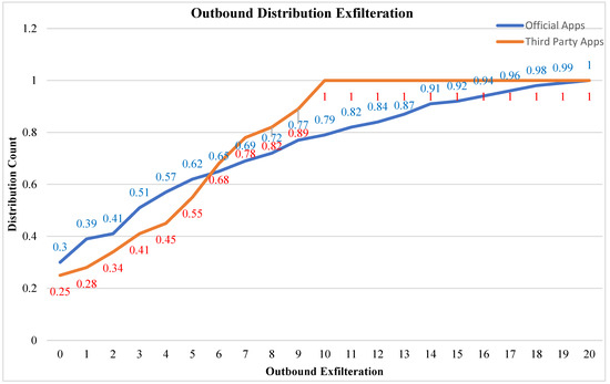 The good news is that there is no direct correlation between the devices and the app managing the sensitive data flows. However, IioT applications have inbuilt data flow using SMS, API [37,38,39,40], or push notifications with external Internet requests when integrating with other devices or web portals. The cumulative distribution for external interface and outbound exfiltration is illustrated in Figure 11.