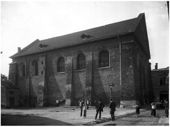The photograph shows the building as it was around the second half of the eighteenth century and the beginning of the nineteenth century. The building, designed by Giovani Baptiste Belotti, underwent several transformations mainly due to fires in 1660, 1739, and 1842. The changes in the architecture of the building mainly concerned the form and shape of the roof. At first, the building was covered with a pyramid roof, then the roof was changed into a gable roof, and finally it was rebuilt as a mono-pitched roof, which it has retained up the present. Moreover, due to its defensive character, New-Town synagogue was strengthened from the outside with conspicuous buttresses. The function of the building has also changed over the years. During the Second World War, it was used as a stable and later as a warehouse by Germans who stayed in Rzeszow for some time. The synagogue, badly damaged during war, was rebuilt and restored in the 1960s. During this reconstruction, its initial architectural structure and form was modified, and its original appearance was changed in order to adapt it for use as the Art Exhibition Office. The New-Town synagogue building was included in the national register of monuments in 1978, and its historical photograph is in the collection of the Photography Gallery of Rzeszow [43].