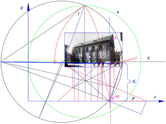 On the basis of the intersection points of parallel lines it could be established the vanishing points and the horizon line h (Figure 3). The accuracy of the photograph and its suitability for reconstruction were confirmed by the perpendicularity of the vertical lines to the horizon line. As in previous research [27], in order to establish a principal point, the angle between a diagonal of the rectangular building plan and one of its sides was used. The intersection of line l with a circle with diameter V1V2 gave a projection center after rotation. This allowed us to establish a principal point and the radius of the circle o, a circle of depth, so the rest of the base perspective elements were important for restitution. According to the method developed by the authors in a previous publication [28], the base line p was established in parallel with the horizon line h, and it intersected one of the vertices of the rectangle parallel to the building plan.