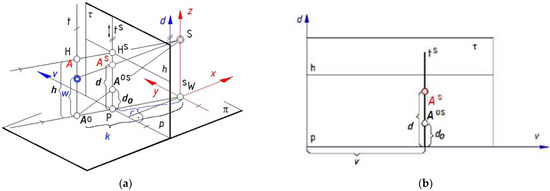 Perspective projection (AS, AOS) of the point A: (a) construction of the perspective images on the projection plane τ; (b) mapping of the projections on the projection plane τ.
