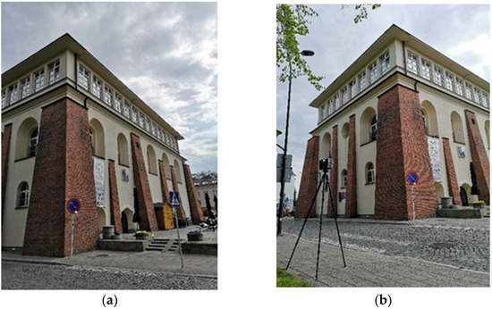 A photographic image is usually an image created using perspective projection, which is subject to the rules of linear perspective [32,33]. Due to the fact that the perspective projection, as the central projection, is the projective representation of the object from a specific viewing position, and its obtained mapping and the object correspond with each other, it is possible to reverse this process. This means that it is possible to reconstruct the shape and location of the object on the basis of its perspective image. From the historical point of view, reconstruction as a process of restitution of an object was initiated by J. H. Lambert in the eighteenth century. Lambert’s work Free Perspective discusses the theory of restitution, that is, how to derive a view point and a building plan on the basis of its perspective image. Restitution has continued to be a subject of research since Lambert’s time. In particular, reconstruction on the basis of perspective images, i.e., photographs, is becoming more and more popular, and various ways of achieving such reconstruction have been proposed [34,35]. Having at one’s disposal several photographs of the architectural object and knowing the position of the camera lens while shooting, it is possible to reconstruct a given object. The analysis of the internal parameters of the camera used for the dimensional analysis of the reconstructed model is presented in [36]. In general, only under certain circumstances is it possible to obtain metric information about the reconstructed object from a single photograph. However, there are several studies that deal with the problem of 3D reconstruction based on a single photograph [37]. The problem of determining the basic elements of perspective on the basis of a photographic perspective image when it is impossible to determine the calibration of the camera is discussed in [38]. Some of the studies involve a single-image reconstruction system using selected edge features in order to build a 3D model. Next, they concern the verification of image accuracy by projecting the model back onto the original image. There are also several studies that investigate the reconstruction of 3D models from perspective lines, assuming geometric constraints resulting from vanishing points. However, the presentation of reality by photographs can give different effects depending on the way the pictured object is framed and the photographic technique used.