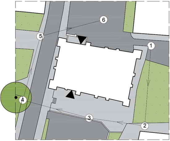 The laser scanning of the synagogue was performed from six positions, that is, six outdoor measuring stations whose locations are shown in Figure 7.