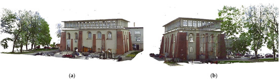 During the measurement acquisition process, a scan registration in color and the scanning profile “Outdoor 20 m…” were selected. The size of the scan in points was 10,242 × 4339 (horizontally × vertically). The scanner software resolution was set at ¼, i.e., 6.136 mm/10 m (10,240 pt/360°). As the result of the scanning, six outer scans were registered using the Faro Scene software [42]. The reference points, such as the spheres, were detected automatically and then verified manually to add missing targets and remove wrongly detected ones. The data set with the registered point cloud composed of 129.92 million points from all scanning positions was downloaded from the scanner. Pre-processed raw scan data as point clouds composed of the points of the external surface of the building were positioned and oriented using their own coordinate systems. The exemplary building elevations obtained as the result of the scanning are presented in Figure 9.