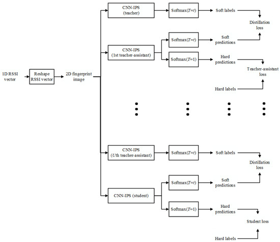 The initial training step of the TAKD-CNN-IPS is similar to those of the CNN-IPS and KD-CNN-IPS, where the 1D RSSI input vector must first be transformed into a 2D fingerprint image. Then, the teacher network will produce soft labels by using Equation (3). Unlike the KD-CNN-IPS, knowledge from the teacher model will first be transferred to the teacher-assistant model. Therefore, the teacher-assistant model will be trained using the following loss function: