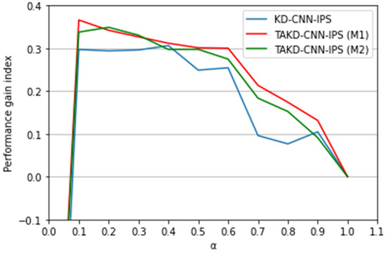 Before the performance of the proposed schemes can be discussed, it is crucial to understand the impacts of the and T hyperparameters. Generally, knowledge distillation trains the student model by utilizing both the true label and studying how the bigger network represents and manipulates data. In order to allow the student network to gain more information from the larger network, the temperature scaling hyperparameter T is introduced to soften the peaky probability distribution of the trained larger network. It is done mostly because soft probabilities from trained networks disclose more information about the data, mainly on the relationship between the RSSI and location classes than the actual label. A higher value of T will generate a softer distribution. Hence, T larger than one is able to improve the performance of the student model. In this work, we have selected T = 2. As mentioned in Section 4, is the weight of the student loss, while is the weight of distillation loss used in the objective function to train the distilled model. Thus, by varying , users can control the importance of the student loss and the amount of information being distilled from the larger model since will automatically change as a result. More explicitly, a higher value of will result in a higher contribution from student loss and a lower contribution from distillation loss, while the opposite will happen with a lower value of . In order to illustrate how the hyperparameter affects the positioning performance of the proposed IPS, the performance gain index has been introduced. The performance gain index P is calculated using the following equation to demonstrate the amount of improvement attained by the knowledge-distilled schemes against the student model CNN-IPS (SM).