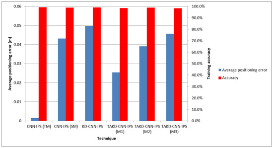 Training accuracy and average positioning error of CNN-IPS (TM), CNN-IPS (SM), KD-CNN-IPS, TAKD-CNN-IPS (M1), TAKD-CNN-IPS (M2) and TAKD-CNN-IPS (M3).