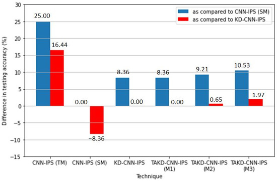 The difference in testing accuracy for all techniques as compared to CNN-IPS (SM) and KD-CNN-IPS.