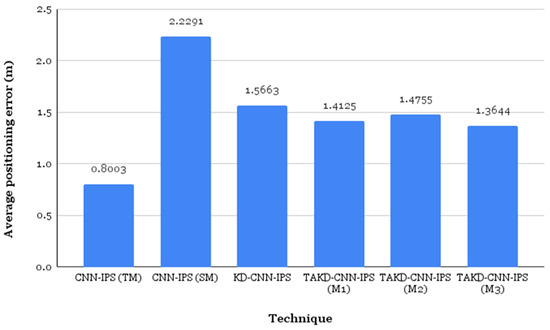 As shown in Figure 6 and Figure 7, CNN-IPS (SM) is the worst performer in terms of average positioning error. It can be seen that all of the models based on the TAKD-CNN-IPS technique outperform both the CNN-IPS (SM) and KD-CNN-IPS counterparts. As expected, TAKD-CNN-IPS (M3) exhibits the best performance amongst the 3 TAKD-CNN-IPS models considered in terms of the average positioning error. More explicitly, the average positioning error of TAKD-CNN-IPS (M3) is 1.4125 m, which only differs by 0.6122 m from CNN-IPS (TM), while the average positioning error of CNN-IPS (SM) is 1.4288 m, which is inferior to that of the CNN-IPS (TM). Additionally, it is found that the proposed TAKD-CNN-IPS scheme with multiple teacher assistants attains a higher testing accuracy than those with a single teacher assistant due to the fact that TAKD-CNN-IPS with multiple teacher assistants has a better capability to pass helpful knowledge from CNN-IPS (TM) to the student model. Interestingly, although the testing accuracies of TAKD-CNN-IPS (M1) and KD-CNN-IPS are identical, as indicated in Figure 5, the TAKD-CNN-IPS (M1) is found to exhibit a performance gain of 9.82% over KD-CNN-IPS in terms of average positioning error. This is because the Euclidean distances between the actual and predicted locations of the test samples are misclassified by the TAKD-CNN-IPS (M1) and are much closer than those of the test samples, which KD-CNN-IPS incorrectly predicts.