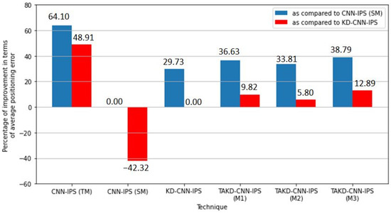 Comparing the performance of CNN-IPS (TM) and CNN-IPS (SM) gives a rough idea of how the size of a network affects the localization performance of CNN-IPS. Next, we will investigate how these knowledge distillation schemes improve the estimation of the CNN-IPS. The training accuracies of all techniques are quite close to each other. In fact, all the methods can achieve a training accuracy of approximately 98%. However, the testing accuracy of the models ranges from 48.68% to 73.68%. Therefore, the testing accuracy clearly indicates which techniques give the greatest and the worst positioning performance. The training accuracy, as well as the average positioning error, of each technique are presented in Figure 4. The training accuracy of all the techniques are quite close to each other, and they manage to achieve at least 98%. Additionally, the average positioning error for each of the techniques is less than 0.05 m. When we compare the positioning performance of the CNN-IPS, KD-CNN-IPS and all of the TAKD-CNN-IPS schemes, the difference in terms of average positioning error is around 0.025 m. For an indoor positioning system, a difference of 0.025 m can be regarded as insignificant. Figure 5 presents the improvement in terms of positioning accuracy of the proposed technique as compared to the baseline CNN-IPS (SM) and the KD-CNN-IPS technique. The figure shows that TAKD-CNN-IPS (M3) is up to 10.53% improved in terms of testing accuracy compared with CNN-IPS (SM). Besides that, the testing accuracies of TAKD-CNN-IPS (M3) and TAKD-CNN-IPS (M2) are superior to those of the KD-CNN-IPS, while TAKD-CNN-IPS (M1) has the same accuracy as KD-CNN-IPS. Hence, this provides evidence that when an intermediate network is introduced, the student network can capture more knowledge because it is trained using the soft distribution produced by a network with a closer capacity.