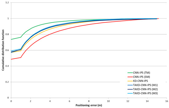 The cumulative distribution function of positioning errors for CNN-IPS (TM), CNNIPS (SM), KD-CNN-IPS, TAKD-CNN-IPS (M1), TAKD-CNN-IPS (M2) and TAKD-CNN-IPS (M3).