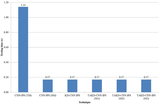 Testing time of CNN-IPS (TM), CNN-IPS (SM), KD-CNN-IPS, TAKD-CNN-IPS (M1), TAKD-CNN-IPS (M2) and TAKD-CNN-IPS (M3).
