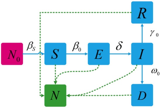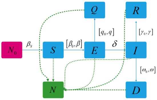 The parameters are adjusted appropriately according to the situation at this stage, and the improved SEQIR model is constructed. The improved SEQIR model is shown in Figure 3.