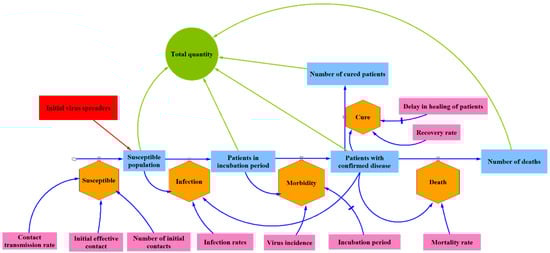 Figure 2 shows the necessary links in epidemic transmission, including susceptibility, infection, morbidity, recover and death; the entities involved in the process include initial virus spreaders, susceptible patients, patients in the incubation period, confirmed patients, recovered patients and deaths from COVID-19; The number of these evolves and develops through the transmission process as shown in Figure 2.