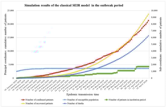 The outbreak period simulated by using the classic SEIR model and parameters with only a single rate does not correspond to the changing situation of the transmission of the epidemic. The results of the simulation using the improved SEQIR model are closer to reality, so the predicted data of the classic SEIR model is compared with the simulation results of the improved SEQIR model from 24 January to 19 April, and the results of the comparison are shown in Figure 11, Figure 12, Figure 13 and Figure 14.