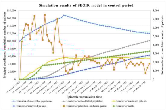 Although during the outbreak period the number of confirmed patients shows exponential growth, the parameters related to the explosion rate are fixed, which is not in conformity with the spread of the epidemic. As Figure 11 shows, in the control period, the predicted data appears as a smooth increasing trend, but the simulation number of confirmed patients presents a mass increase at first and then levels off. This is due to the prevention and control measures having a time lag, and not working right away; however, the subsequent flat growth proved the effectiveness of the control measures, as there is no large-scale exponential growth from 14 February to 26 March. By comparing the predicted results and the simulation results in the control period, it can be found that the improved SEQIR model more accurately describes the transmission situation of the epidemic from 24 January to 26 March, indicating that the effect of our phased study is better.