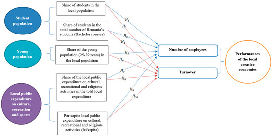 The fundamental question of this paper is: what exactly enhances the development of the CCE, and it could be a matter of local and national authorities and regulations? The reasons to consider urban economies and the listed catalysts were presented in the previous sections, and in the following sections, we assess the impact of the independent variables on the CCI’s turnover and the number of employees as dependent variables. Therefore, in other words, we propose two hypotheses, as Figure 1 presents: