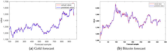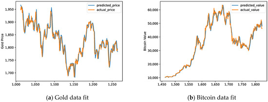 With the help of Python 3.7, the linear regression modeling process was implemented, and through the variables, the pricing data of gold and bitcoin were predicted as the fluctuation range. From our fitting, the prediction accuracy was high, and the results are shown in Figure 6 and Figure 7: