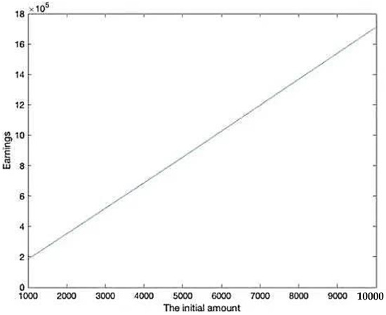 This paper used the established model to obtain a series of data by changing the size of the initial amount, the range of which was from USD 1000 to USD 10,000. Using Python 3.7, finally a straight line was drew. The image is as Figure 10: