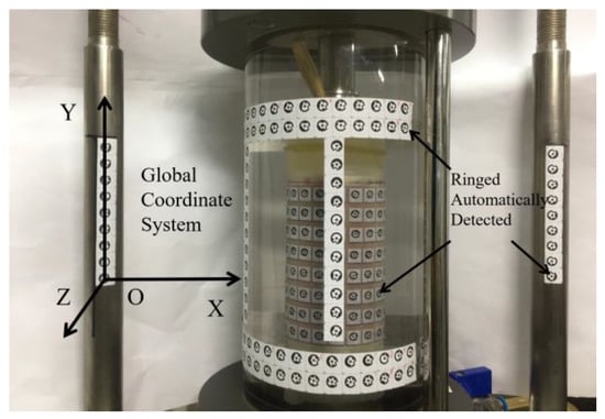 In the present work, four coordinate systems are used to establish the mapping relationship between 2D image points and 3D coordinate points, including the world coordinate system, pixel coordinate system, pixel physical coordinate system and camera coordinate system. Among them, the world coordinate system needs to be established first to unify the three-dimensional information of each point on the soil sample surface. To establish this coordinate system, we pasted several columns of RAD on the left and right loading bars and triaxial apparatus surface in the middle, with the specific location as shown in Figure 1, and then used the lowest coding point of the left loading bar as the origin to establish an O-XYZ coordinate system as shown in the figure. The distance between the left and right loading bars was measured by a vernier caliper and input into the PM software to define the scale of the world coordinate system.