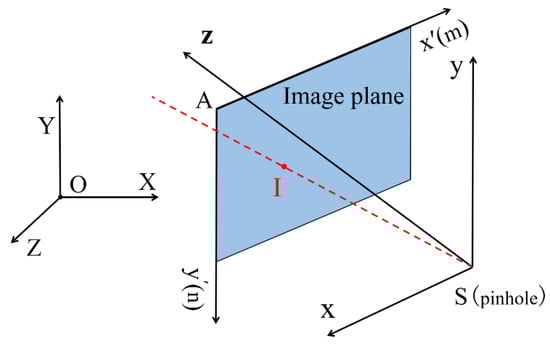 In order to transform the image pixel information from the physical coordinate system to the camera’s local three-dimensional coordinate system (S-xyz), PM software uses the camera imaging principle to restore the angular relationship between the marked point and the camera and establishes the camera’s local three-dimensional coordinate system with the camera’s pinhole point S as the origin. The coordinate system transformation method is shown in Formula (2).