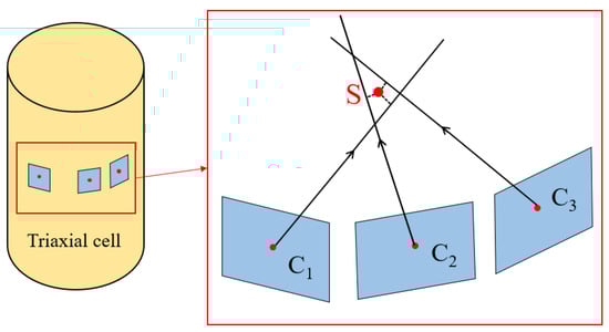 The propagation path of light in the triaxial test is: water → organic pressure chamber → air, during which the refraction effect will distort the obtained image of the soil sample [8,33]. A method to correct this is using the three-dimensional refraction correction model proposed by Xia et al. [34,35], which adopts the ray tracing method to correct the error of the image. The correction formula is shown in (5), which is used to determine the exact position of the imaging object point in three-dimensional space, where na and nc are the refractive index of air and pressure chamber materials, is the direction vector of the incident light, and is the direction vector of light after refraction.