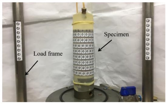 Different from the traditional triaxial test, this test adopted the photogrammetry as the main measurement method and used the strain control method to conduct the unconsolidated undrained (UU) test with the confining pressures of 100 kPa, 150 kPa and 200 kPa. The accuracy of the whole photogrammetric system had been verified before tests. Specific steps of the experiment referred to the work of Wu [39]. Each soil sample was wrapped with a rubber film, on which eight lines of coding points were pre-marked, with an interval of 10 mm between lines, as shown in Figure 4. The test shear rate was set as 0.2 mm/min. Before loading, we took a group of pictures around the soil sample as the initial data. During the test, each time the displacement increased by 1 mm, we paused the loading and took another group of pictures until the total displacement reached 14 mm. After the test, the photos were transferred to the PM software for calculation, with which the true three-dimensional coordinates of all camera optical centers, coding points on the surface of the pressure chamber and coding points on the surface of the soil sample were obtained after eliminating the refraction error.