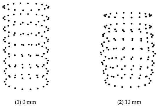 Although the stress–strain curve can be used to estimate the process of shear band formation, this method is not intuitive and accurate enough, nor can it help to understand the evolution information in the process of shear band formation. The local deformation of the soil sample in the deformation process can be determined by comparing the three-dimensional space coordinates before and after the deformation of the coding point. Many studies show that the local axial deformation of a soil sample can effectively reflect the formation and evolution of the shear band in the process of shear failure of the soil sample [41,42]. Figure 7 demonstrates the three-dimensional scattered points of three-dimensional coordinates (X, Y, Z) extracted from a soil sample with a dry density of 1.5 g/cm3 and confining pressure of 200 kPa.