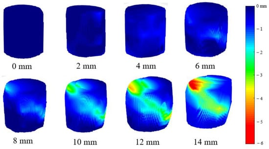 It can be seen that the soil sample is a standard cylinder at the initial state and then becomes an elliptical cylinder protruding in the middle when the axial displacement reaches 10 mm. Although such a comparison can intuitively show the position change of each point in the soil sample, the dynamic change rule of the shear band in the soil sample is yet to be known. Therefore, we used Matlab to conduct a polynomial interpolation on the four-dimensional coordinates (X, Y, Z, dz) of the discrete data points and obtained the three-dimensional displacement field diagram of continuous soil samples as shown in Figure 8, where dz represents the axial displacement increment of each point of the soil sample, and the colors depict the deformation degrees of local regions of the soil sample.