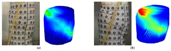 In Figure 8, the three-dimensional spatial displacement field of the initial state of the soil sample has a uniform color distribution, which indicates that the confining pressure applied during the test does not form a shear effect on the soil sample. When the axial displacement reaches 2 mm, a compression effect starts to occur in the soil sample, but the axial and radial deformations are still relatively consistent, causing the soil shape to be nearly unchanged. At this time, the color distribution of the field map changes slightly, so it can be estimated as the initial stage of the soil sample shearing. When the axial displacement reaches 4 mm, the uneven particle distribution and density in the soil cause a large stress concentration effect and disordered deformation in the soil. From the initial stage of shearing, the color change of the displacement field is mainly concentrated in the middle area of the soil sample because the deformation of the upper and lower ends of the soil sample is limited by the end restraint and end friction, while the middle region of the soil sample is free from these. When the axial displacement reaches 6 mm, the local deformation area develops diagonally to form a connected area, and some local areas have undergone plastic deformation, which can be used to predict the development trend of the soil sample shear band. When the axial displacement reaches 12 mm, the deformation area in the middle region of the soil mass increases obviously, and the stress concentration effect in the plastic deformation area increases gradually. The uneven change areas in the soil sample gradually connect to form a significant band area, namely, the shear band of the soil sample. At this time, the shear band has completely penetrated the soil sample, and the soil has been sheared, resulting in the shear failure stage of the soil sample. After that, the soil sample is divided into upper and lower regions that are roughly symmetrical by the shear band, and the whole soil consists of independent upper and lower parts separated by the shear band, between which there is friction. With the continuous increase of the axial pressure, the axial displacement reaches 14 mm, and the upper and lower soil masses produce relative slip, leading to the post-failure stage. The deformation area of the soil mass has obvious signs of expansion centered on the shear band. Figure 9 compares the shear deformation of the soil sample with axial displacements of 10 mm and 14 mm.