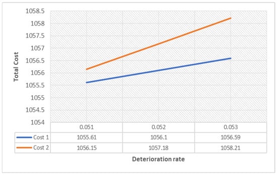 Figure 5. Behaviour of total cost with . - Figure 5 represents the behavior of the total cost with respect to the deterioration rate. The graph with blue colour represents the cost when meaning is constant and is increasing whereas the graph with red colour represents the total cost when meaning is constant and is increasing. This graph also concludes that when , TC is lower compared to when .