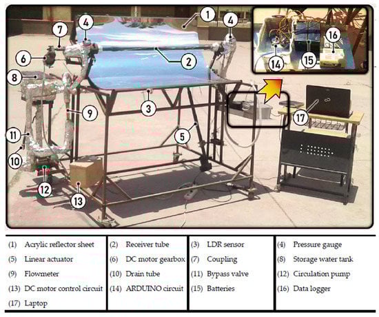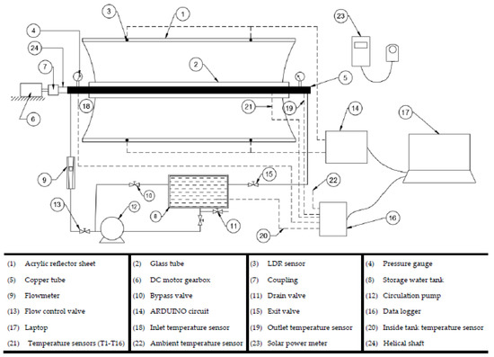 The experimental test rig was designed mainly to study the PTC performance with a helical shaft rotating centrally inside the receiver. An experimental test rig of PTC is shown in Figure 1, while its schematic diagram is illustrated in Figure 2. The main elements of the test rig comprise a PTC, a solar tracking mechanism, and measuring instruments.