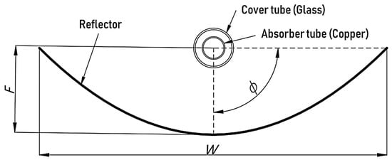The width of the aperture, W, of the parabola and its focal length, F, are determined using the following Equations [33,34]: