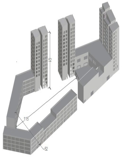 The plot includes many long, four-story buildings, with some spotted setbacks and three residential towers, 52 m tall (see Figure 3). The volume layout was carefully defined during the early design stage so as not to compromise the possible solar gains during winter with the shadow of the towers which are therefore located to optimize their own solar exposure while preserving the inner courtyard’s quality and avoiding any canyon effect (which would influence the outdoor temperature, air speed, and air quality).