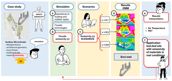 The study adopted a comparative methodology to estimate how the different properties of materials, and reflectance in particular, may influence the performance of a building envelope with reference to outdoor microclimatic comfort. The methodology was developed by choosing a specific site to carry out the study in Bologna, which was chosen as a case study. Every possible location has its own unique features and specific complex interactions of multiple factors depending on the site and the surroundings that may impact on outdoor microclimate. Among these conditions, the density of the urban fabric, the distance between buildings, the volume configuration, the building envelope materials, the properties of vertical and horizontal surfaces, as well as some climatic conditions are discussed in the following text. The authors are aware of this complexity and used a demo-site to create a sequence of steps aimed at fixing some parameters (which may be variable or constant) and focused on the emissivity of the envelope materials for optimization purposes. Following the Stefan–Boltzmann Law, emissivity is defined as the ratio of the radiation emitted by the surface to the radiation emitted by a blackbody at the same temperature. The radiation may be reflected, absorbed, and transmitted by surfaces in relation to surface phenomenon, e.g., color surface [106].