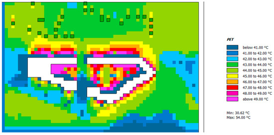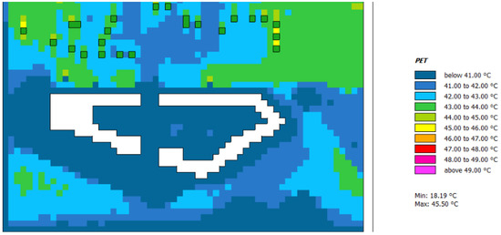 These effects must be considered during the daytime variations, and Figure 10 and Figure 11 show the air temperature and PET variations for each of the three scenarios which referred to a specific test day, namely 27 July 2019, the hottest day in 2019 (according to historic dataset), at 12 o’clock.