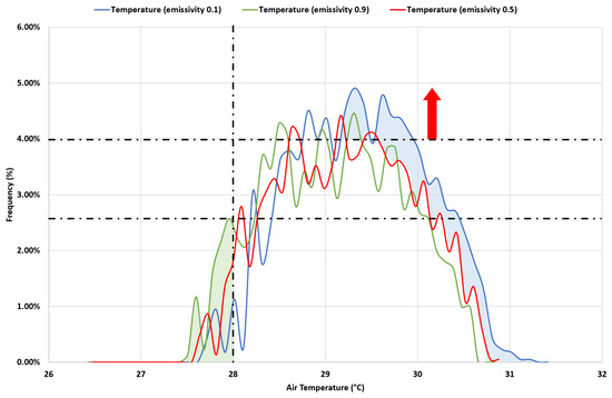 Figure 11 refers to air temperature considering the three emissivity values 0.1, 0.5, and 0.9, showing that in the case of 0.1 (blue line), the frequency of temperatures under 28 °C is increased compared to the other two options (green and red lines), as evidenced by the green area of the graph. On the other hand, in the simulation with emissivity equal to 0.1, a higher frequency of temperature values higher than 29 °C is shown. In the case of emissivity equal to 0.5 or 0.9, the percentage of the surface of the OMM with temperatures between 29 °C and 30 °C is lower than 4%, while in the case of emissivity equal to 0.1, these surfaces represent more than 4% of the OMM (blue area and red arrow). Furthermore, the entire area with emissivity of 0.1 has a higher frequency than values between 30 °C and 31 °C (blue area).