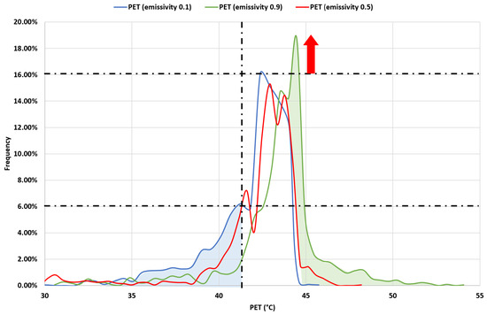 Variation in the percentage of PET as the emissivity varies. Red arrow highlight frequency increase of temperature in case of emissivity equal to 0.9.