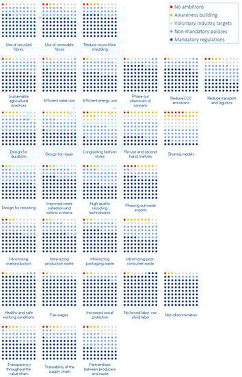 As a second instrument type, we included voluntary industry targets. Given pressures imposed by NGOs and reputational effects among customers, voluntary industry targets and CSR policies can be considered as more compulsory than awareness building, while enhancing companies to remain competitive in the long term [82,169,170]. Finally, government policies can be considered the most compulsory, taking into account the difference between non-mandatory policies, e.g., fiscal incentives, and mandatory regulations that are enforceable [45,76]. Notably, there is a generally higher concentration of mandatory EU legislation towards the end of the life cycle (e.g., waste policies), while policies targeting consumption are typically less compulsory.