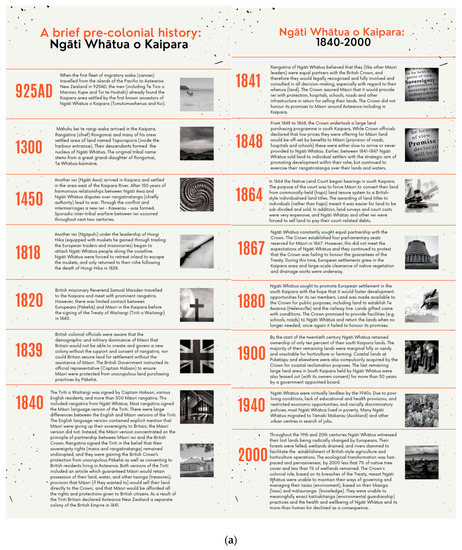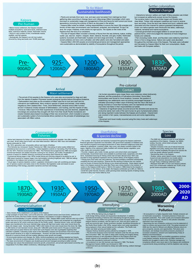 (a) Pre-colonial history timeline of Ngāti Whātua o Kaipara (Source: [33,34,35]. (b) Kaipara moana environmental history.