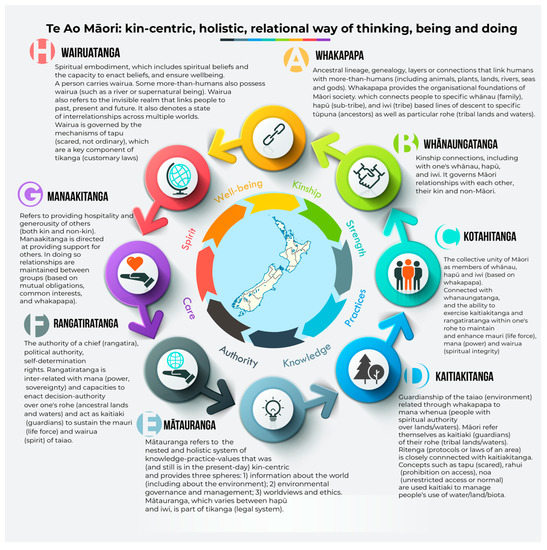 In te ao Māori, all beings are linked through whakapapa back to the beginning of time; this includes the gods starting with the primaeval parents: Papatūānuku (Earth Mother) and Ranginui (Sky Father) [36]. Whakapapa ties all entities together, both humans and more-than-humans, through kinship. The concept of whakapapa goes beyond simplistic notions of genealogy as being about biological descent (as per dominant Western ontologies and scientific knowledge) and instead the basis on which Māori socio-cultural, economic, and political systems of organisation [37,38]. Te ao Māori positions Māori as part of and sharing kinship with humans and more-than-humans (including plants, animals, soils, rocks, waters, seas, and supernatural beings), all of which contain mauri. Accordingly, humans are part of (rather than separate from) the natural world and possess specific responsibilities to care for their taiao (including all their non-human kin). Numerous Māori whakataukī illustrate the kin-centric, holistic, and relational worldviews of Māori wherein the mauri and wairua of humans and taiao are bound together [39,40,41]. A whakataukī used by Ngāti Whātua kaumatua, ‘Toi tū te whenua, whatungarongaro te tangata the land endures, while the people come and go’ illustrates two things: firstly, Māori cultural identity (as individuals and members of whānau, hapū and iwi groupings), as well as their mana, wairua, and mauri, are all inexhaustibly connected to their moana, whenua, awa, and maunga; secondly, through whakapapa, Māori are duty bound to care for their more-than-human kin just like they would for their human relatives. Māori obligations and responsibilities to care for their taiao is known as kaitiakitanga.