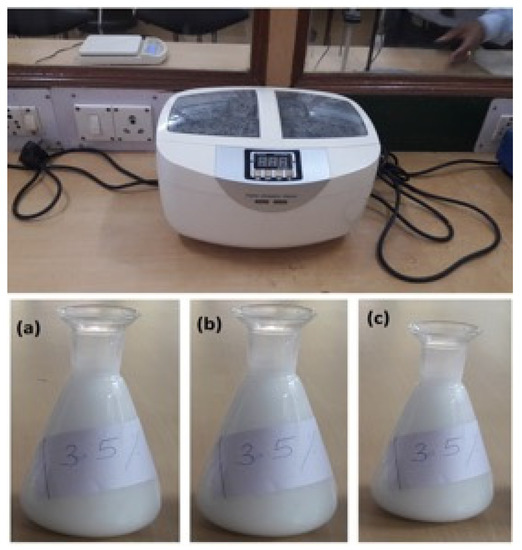 The nanofluid has been prepared for four different volume concentrations of 1.5%, 2.5%, 3.5% and 4.5% by mixing the nanoparticles of 99.9% purity in distilled water. As a surfactant, sodium dodecyl benzene sulphonate was utilized to make more soluble and stable nanofluid with a surfactant to nanofluid proportions of 10:1. Sodium dodecyl benzene sulphonate is a high-content anionic surfactant having good emulsility and dispersity properties as compared to other surfactants. The significance pH for improving the stability of -based nanofluid was attained at 5.0. Better dispersing of nanoparticles in distilled water is required to obtain a homogeneous fluid. The homogenization and sonication of all solutions were carried out in an ultrasonic homogenizer, shown in Figure 3, for three days to reduce particle aggregation and nanofluid sedimentation. The stability of the nanofluid is checked by using a UV-vis spectrometer (Evolution 201). To check the visual stability of nanofluid, Figure 3 shows the photograph of nanofluid taken immediately after preparation as well as after two and then after four days of nanofluid preparation.