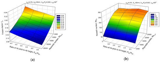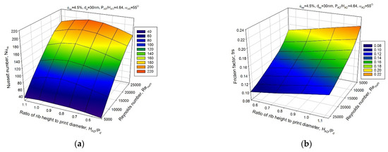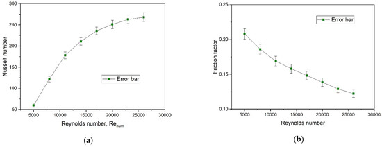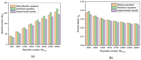 The result of these comparisons is shown in Figure 4a,b. The figure indicates that there was extremely strong agreement between the current analysis conclusions and those predicted by the Dittus–Boelter equation and Gnielinski equation of, and Blasius equation, and Petukhov equation of for a smooth surface.