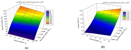 Experimental results are reported in terms of, and as a function of , ranging from 5000 to 26,000, from 1.5% to 4.5% at constant of 30 nm, from 0.533 to 1.133, from 3.71 to 6.71 and range from 35° to 65°. The effects of nanoparticle volume fraction variation and artificially rib-roughened square duct on heat transfer are studied. Figure 6 shows the variation of and with at different of nanoparticle ranging from 1.5% to 4.5% of the entire test surface with the rib-roughened wall, which is performed at of 30 nm, and 55°. Figure 6a illustrates that as increased, also increased, and it also shows an enhancement in average heat transfer by 2.06%, 7.02% and 10.74% at and 4.5%, respectively, when compared to. This enhancement is due to the nanofluid’s thermal conductivity and Brownian motion increment. Whereas Figure 6b illustrates that decreased as increased, and when the concentration of nanoparticles increased average friction factor increased. Furthermore, the friction factor is augmented around 5.55%, 9.25% and 13.15% at and 4.5%, respectively, in comparison to.