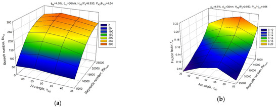The effect of on and with is illustrated in Figure 8, where ranging from 3.71 to 6.71 and other parameters, 30 nm, and 55° were fixed. Figure 8a clearly indicates that increased as increased, and it is maximum when 4.64, minimum at. Figure 8a also indicated an enhancement of 5.32%, 9.83% and 2.87% in average heat transfer at and 5.71, respectively, as compared to. The heat transfer coefficient raised when the value of relative rib pitch increased from 3.71 to 4.64, and then it decreased with a further increase in the value of relative rib pitch for all values of. Figure 8b clearly confirms that is minimum at and maximum at . It is also witnessed that friction factor is improved around 32.34%, 20.51% and 10.25% at and 5.71, respectively, concerning. The details of fluid flow for the cases of arc angle and arc-shaped ribs are shown in Figure 9. It displayed the variation of and with at ranging from 35° to 65° when other operating parameters are kept constant as of 30 nm, and.