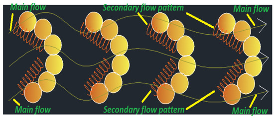 Figure 9a shows an enhancement in average heat transfer of 8.43%, 13.08% and 4.64% at 45°, 55° and 65° respectively, when compared to35°. It is also observed that the heat transfer coefficient enhanced when the arc angle increased from 35° to 55°, and then it decreased with a further increase in arc angle. Moreover, a higher heat transfer rate is found at 55° due to the strong secondary flow-induced arc angle of dimpled ribs inside the flow channel, and 35° provides the low heat transfer rate for all values of. Figure 9b indicates that increases when the arc angle increases from 35° to 55°, and then it decreases with a further increase in arc angle. An enhancement of 22.46%, 34.58% and 10.35% is found in friction factor at 45°, 55° and 65° respectively, when compared to 35°. Furthermore, from all these cases investigated, it is observed that the maximum heat transfer rate is found at and 55° for all values of. The results reveal a stronger rotational momentum of secondary flow along the dimpled arc pattern ribs shown in Figure 10. It is seen from the flow pattern that the main flow is guided over the dimpled rib with an arc pattern, which tends to increase the turbulence intensity. On the other side, the secondary flow is developed in the vicinity of the dimpled rib, which tends to boost the intensity of turbulence of the fluid, thus enhancing the rate of heat transfer. Furthermore, it is evident from this discussion that the ratio of rib height to print, the ratio of rib pitch to rib height, and the arc angle should be maintained to increase the velocity of the fluid moving through the duct to induce local turbulence.