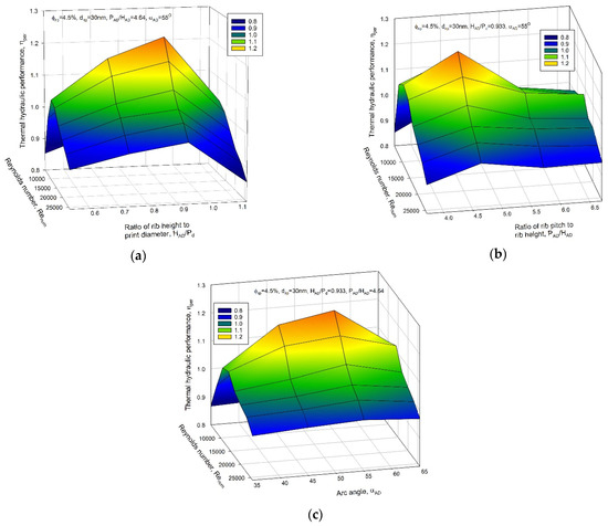 The thermal-hydraulic performance of three different dimpled with combined arc-shaped ribbed square ducts is described in Figure 11. The thermal-hydraulic performance was expressed as [46]. The greater the value of this parameter, the better the performance of the heat exchanger. Figure 11a shows the effect of the ratio of rib height to print range from 0.533 to 1.133 on thermal hydraulic performance for selected values of, where it can be experiential that the value of is increased when the value of increases from 0.533 to 0.933, and then it decreases with a further increase in the value of . It is evident from this figure that there is an enhancement of 2.02%, 13.84% and 19.79% in overall thermal performance at and 0.933, respectively, when compared to and maximum value of is found at for. Figure 11b represents the thermal-hydraulic performance as a function of the ratio of rib pitch to rib height , ranging from 3.71 to 6.71 for the particular values of. From the figure, it can be clearly seen that the value of is increases when the value of increases from 3.71 to 4.64 and then it starts decreasing with a further increase in the value of from 4.64 to 1.133. There is an enhancement of 8.73%, 20.03% and 3.98% in overall thermal performance at and 5.71, respectively, with respect to. The highest value of the thermal-hydraulic performance is observed at and lowest at for. Figure 11c represents the thermal-hydraulic performance as a function of arc angle in dimpled rib ( equal to 35°, 45°, 55° and 65° for the particular values of. Here it can be clearly recognized that the value of is increases when the value of increases from 35° to 55° and then it starts decreasing with a further increase in the value of . The thermal-hydraulic performance is significantly high, about 13.01%, 16.36% and 3.85%at 45°, 55° and 65° respectively, when compared to 35°. The highest value of the thermal-hydraulic performance is observed at55° and lowest at 35° for.